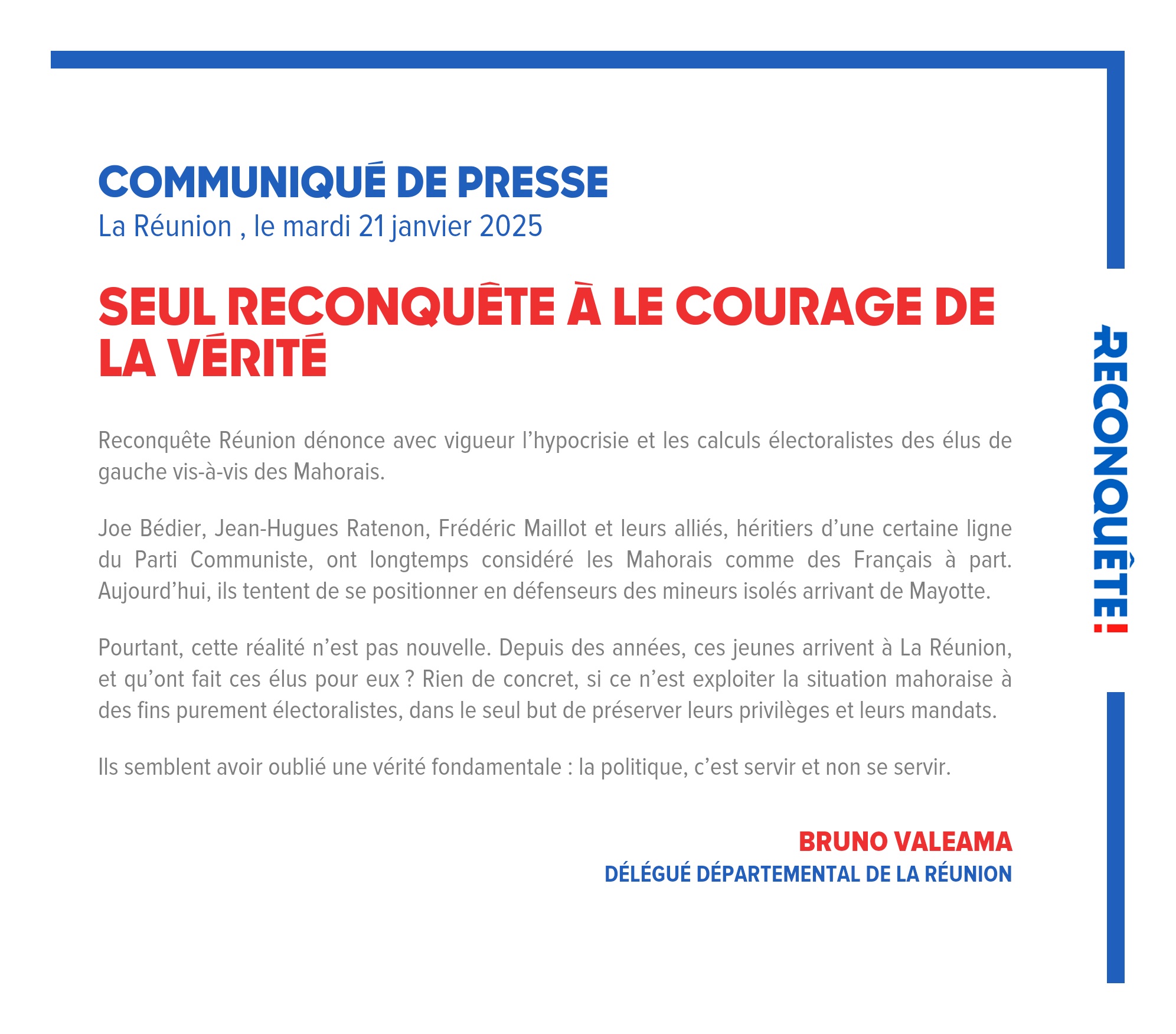 Reconquête Réunion dénonce avec vigueur l’hypocrisie et les calculs électoralistes des élus de gauche vis-à-vis des Mahorais.